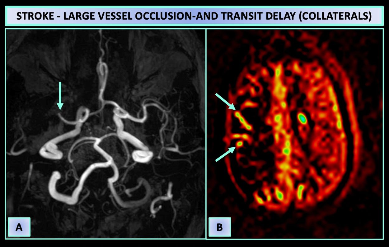 Arterial spin labelling (ASL) is a noncontrast, magnetic resonance perfusion technique which can provide information about the parenchymal perfusion status and collaterals in acute stroke. Its role in the setting of large vessel occlusion (LVO) is underutilized due to the limited availability of magnetic resonance imaging (MRI) in the emergency settings. However, it might serve as an useful adjunct to other perfusion modalities in future. Objective To study ASL perfusion patterns in anterior circulation LVO stroke and evaluate the presence of arterial transit artefacts (ATA) as a surrogate marker of collaterals.